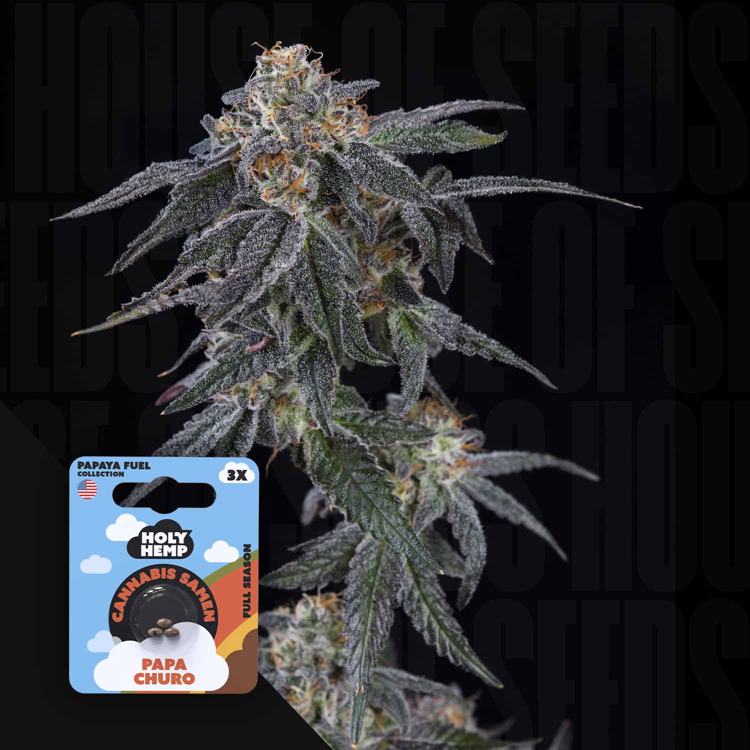 Papa Churo est un hybride à dominance indica, issu du croisement entre Purple Churo et Papaya Fuel. La variété combine la génétique colorée et relaxante de Purple Churo avec les arômes tropicaux et fruités de Papaya Fuel, créant ainsi une plante impressionnante tant visuellement que gustativement. Elle pousse robuste et touffue, avec des branches latérales fortes et une structure stable, typique des plantes à dominance indica. Pendant la phase de floraison, qui dure entre 56 et 65 jours, se développent des buds denses et résineux, souvent marqués d'accents violets. Avec une hauteur pouvant atteindre 1,5 mètre, Papa Churo convient aussi bien à la culture en intérieur qu'en extérieur, préférant cependant un climat tempéré à méditerranéen. Les rendements sont moyens à élevés et offrent aux cultivateurs une combinaison rentable de puissance, d'arôme et d'apparence.