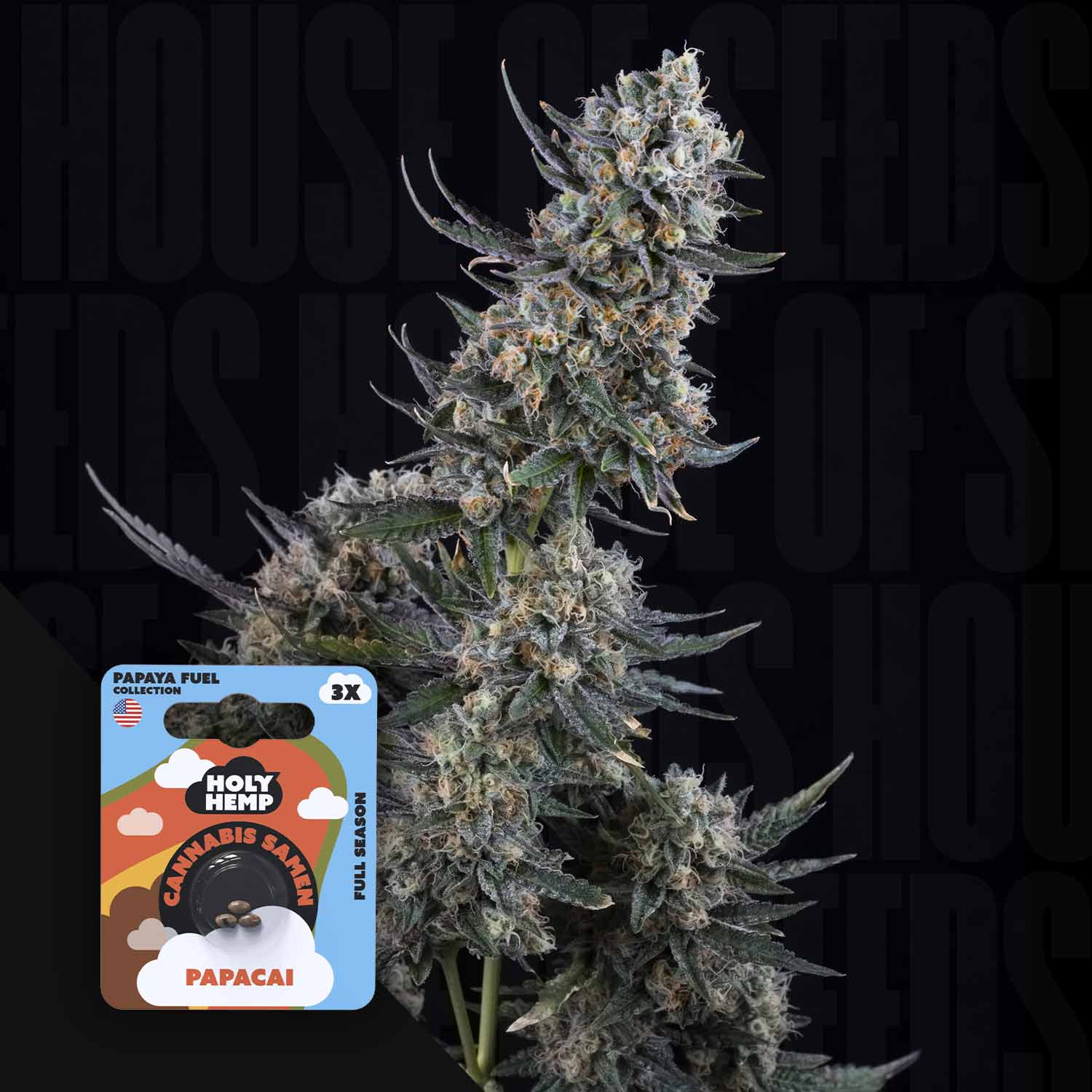 Papacai est un hybride à dominance indica, issu du croisement entre Acai et Papaya Fuel. La variété se distingue par une structure robuste et buissonnante avec des branches latérales fortes et une hauteur pouvant atteindre 1,5 mètre. Elle nécessite environ 56 à 65 jours de floraison et offre des rendements moyens à élevés, qui s'expriment de manière optimale tant dans un climat tempéré que méditerranéen. Les fleurs denses sont riches en résine et recouvertes d'une couche intense de trichomes, ce qui valorise non seulement l'apparence mais indique également une forte puissance. Dès la phase de floraison, Papacai déploie son arôme caractéristique : un mélange sucré et fruité de papaye et de notes tropicales, complété par des nuances terreuses et légèrement épicées. La teneur élevée en THC, d'environ 20 à 25 pour cent, garantit que la variété peut rivaliser en termes de puissance avec les meilleurs hybrides premium.