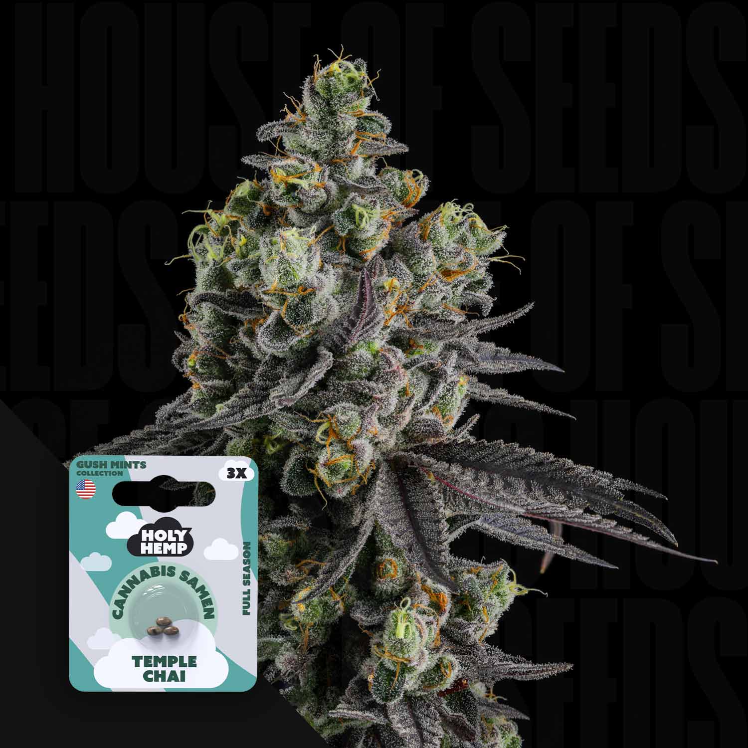 Temple Chai est un hybride exclusif de la maison Holy Hemp qui réunit les meilleures caractéristiques de deux variétés au caractère affirmé : Orange Chai et Gush Mints. La variété présente une forme de croissance robuste et buissonnante, typique des hybrides à dominance Indica. Avec une période de floraison d'environ 56 à 65 jours, Temple Chai développe des fleurs denses et résineuses, qui impressionnent également visuellement par leurs accents orange et violets. Les plantes réagissent de manière sensible à leur environnement, ce qui les rend particulièrement intéressantes pour les cultivateurs expérimentés. Alors qu'Orange Chai préfère des conditions plus chaudes, Gush Mints apporte une adaptabilité aux climats tempérés – une combinaison qui fait de Temple Chai une variété polyvalente. Dans des conditions idéales, elle offre des rendements moyens à élevés et récompense les cultivateurs par une production de résine prononcée, qui dégage déjà pendant la floraison un arôme intense, sucré-citronné et mentholé-épicé.